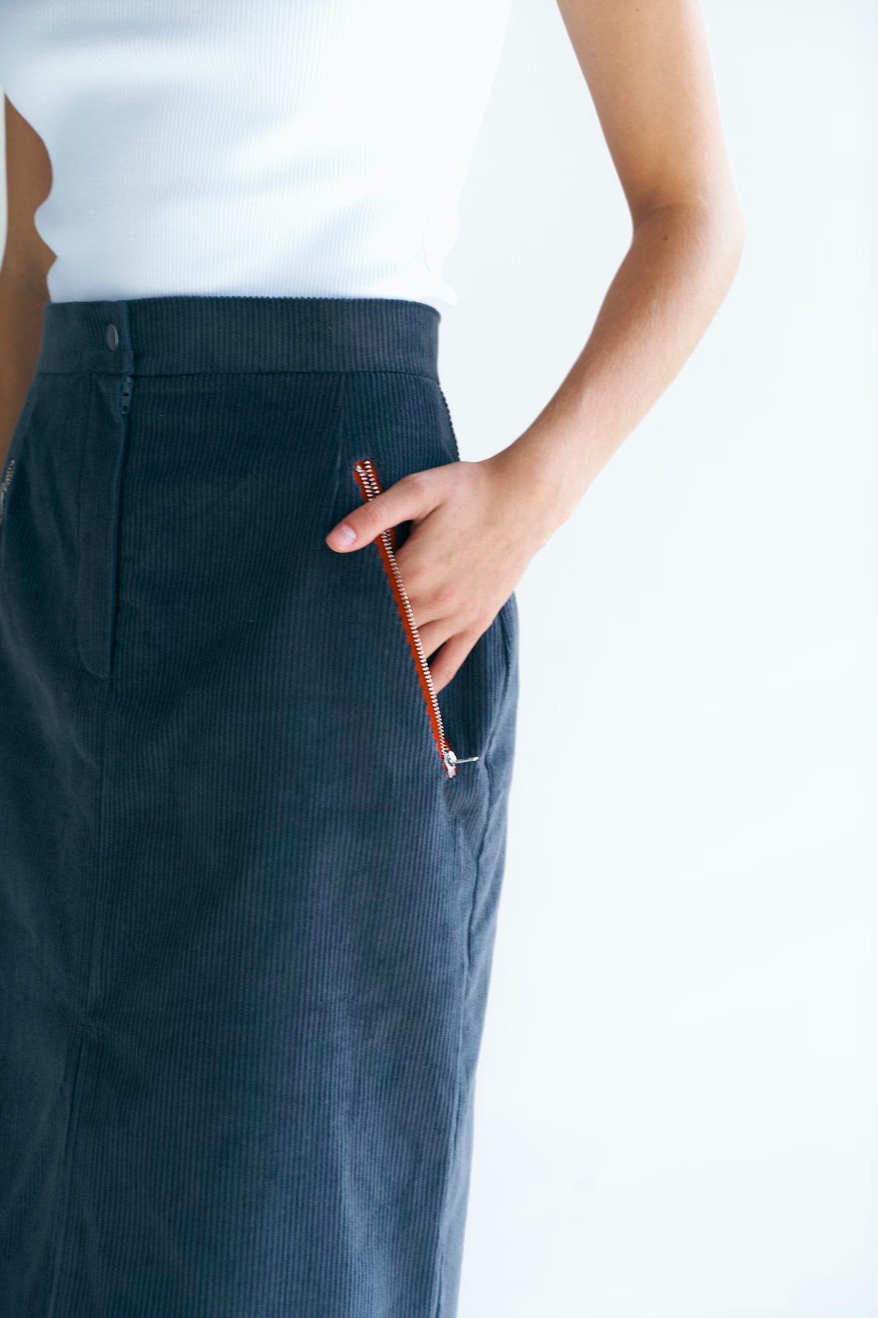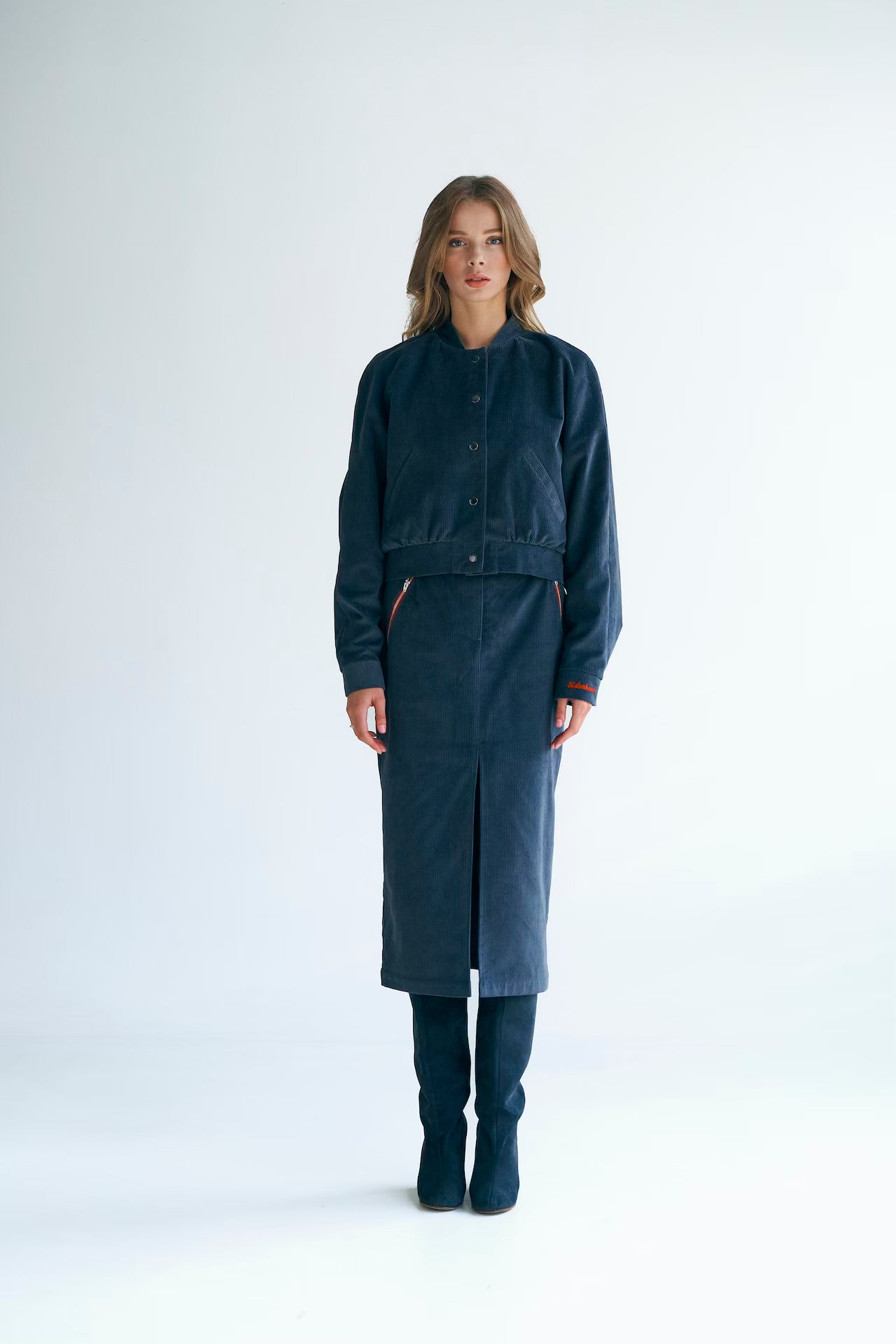 Спідниця-олівець з розрізом. Має дві функціональні кишені, акцентовані червоними блискавками. Чудово поєднується з бомбером із цим ж комплектом, а також з іншими предметами вашого гардеробу.